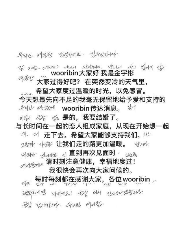 金宇彬通过亲笔手写信向粉丝传达婚讯,信中写道:“是的,我要结婚了。与长时间一起的恋人组成家庭,从此携手同行。”信中特别感谢粉丝多年支持,并称希望获得大家温暖的祝福。